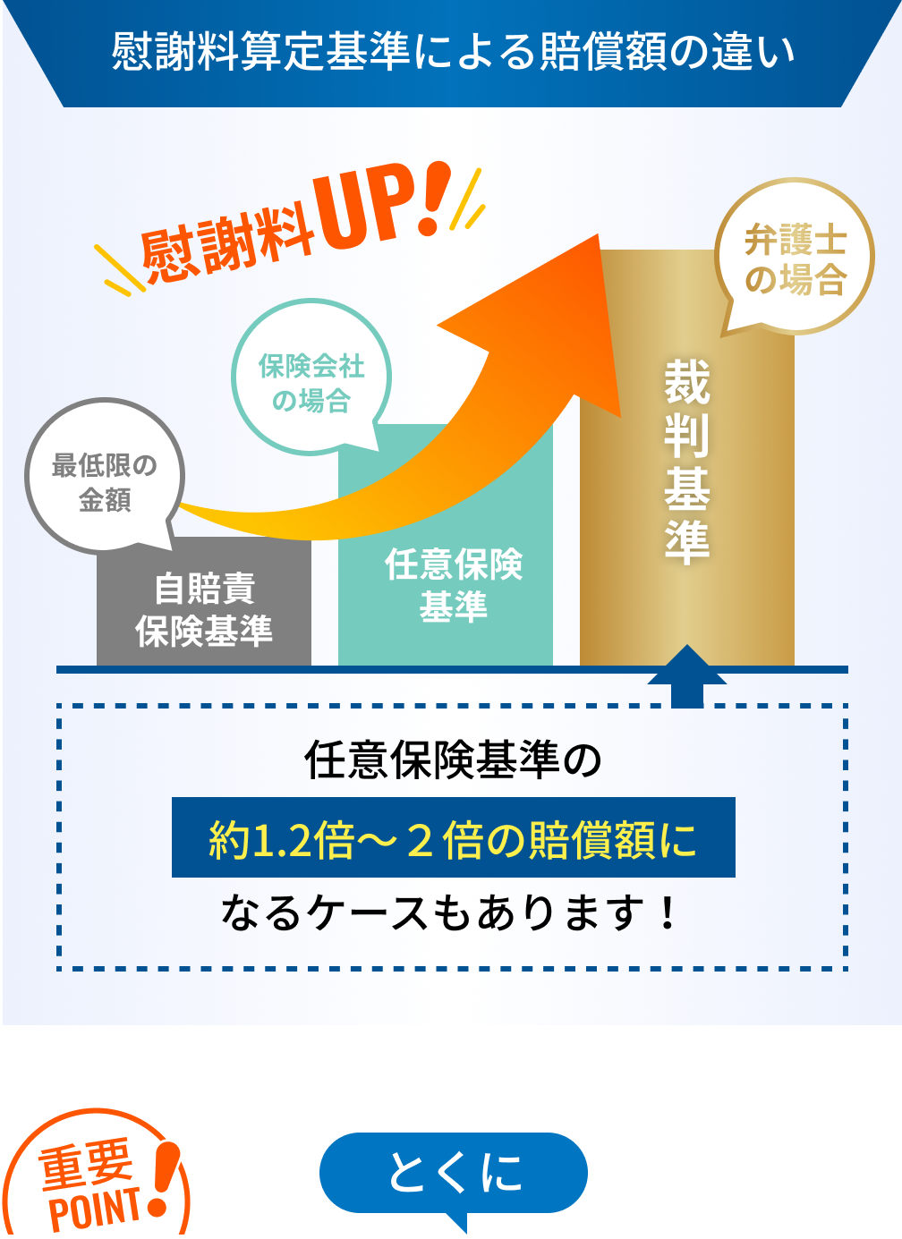 弁護士は、保険会社が独自で慰謝料を算出する 「任意保険」 の基準ではなく 「裁判基準」 で慰謝料を請求するからです!